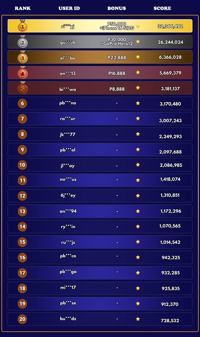 Final Week Top 10 Winner is based on the player with the highest winning score total in Baccarat Games “During Whole Tournament (2025/10/20 ~ 2025/11/2)” .